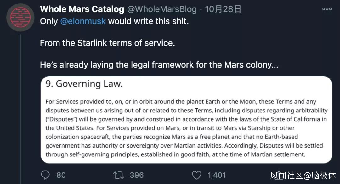 但是未來,如果你遇到馬斯克他們家產品的網絡服務條款的時候,恐怕不能再像以前那樣漫不經心了。否則,你就有可能影響你的“地球人”身份。當然有個前提是如果你活得夠久,又有機會移民火星,你真的就可以見證歷史,變成“火星人”了。