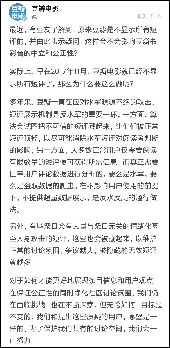 1)三年前的產品改動:部分短評展現機制是3年前上線的產品改動,目前已經書影音全產品線應用,經歷了一段時間長度才有個別用户提出異議,已經説明了這個產品調整對絕大多數用户使用體驗並不會造成明顯的影響;事實證明,幾年來豆瓣通過短評展示策略的調整,在優化短評消費體驗、清除水軍信息影響上,獲得了不錯的效果。