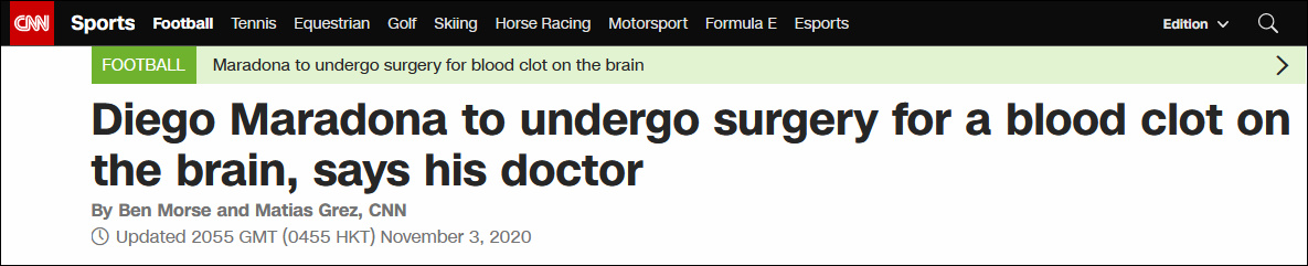 據悉,馬拉多納的手術時間為當地時間週二晚上8點,即北京時間的本週三早上7點。按計劃,手術應該已在進行。