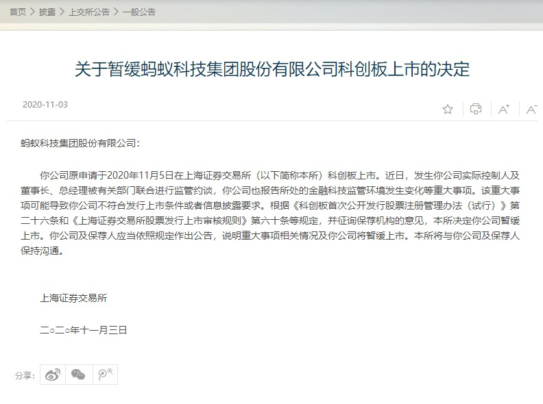上交所:暫緩螞蟻科技集團股份有限公司科創板上市_好看視頻