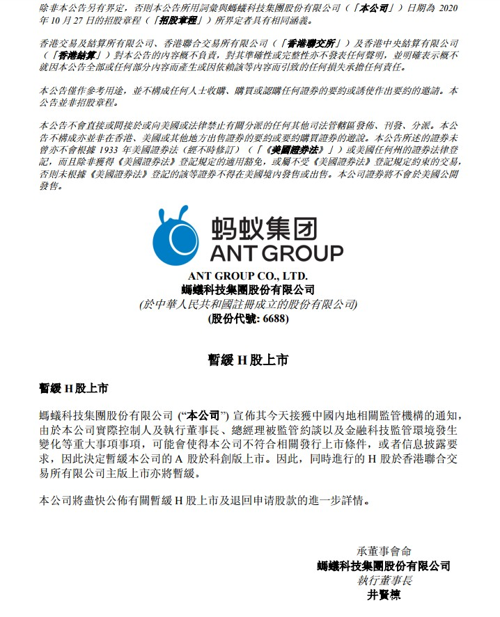 重磅!螞蟻集團A股H股雙雙暫緩上市_風聞