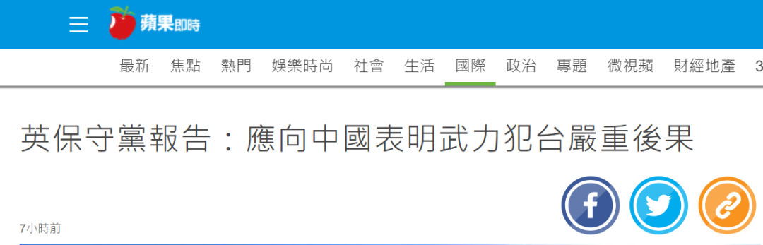 台灣一些媒體目前也迅速報道了這部分內容,一些急於給自己“壯膽”的台獨媒體更是幾乎直接將這個報告的説法等同於了英國保守黨的姿態,儘管英國保守黨並沒有做出任何這樣的表態,該報告只是幾個反華政客自己的態度。