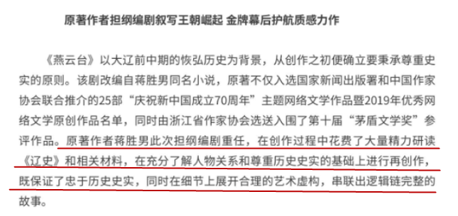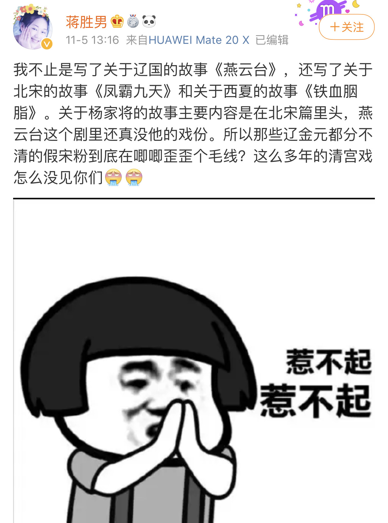 “我不止是寫了關於遼國的故事《燕雲台》,還寫了關於北宋的故事《鳳霸九天》和關於西夏的故事《鐵血胭脂》。關於楊家將的故事主要內容是在北宋篇裏頭,燕雲台這個劇裏還真沒他的戲份。所以那些遼金元都分不清的假宋粉到底在唧唧歪歪個毛線?這麼多年的清宮戲怎麼沒見你們。”