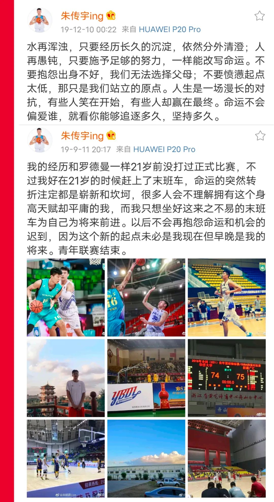 你看他寫的微博,這是一個有頭腦、有想法的中鋒。其實在18歲以前,小朱從來沒有接受過系統的籃球訓練,父母也從來沒有打過籃球,個子也只有180左右。朱傳宇就是中國的馬爾揚諾維奇。