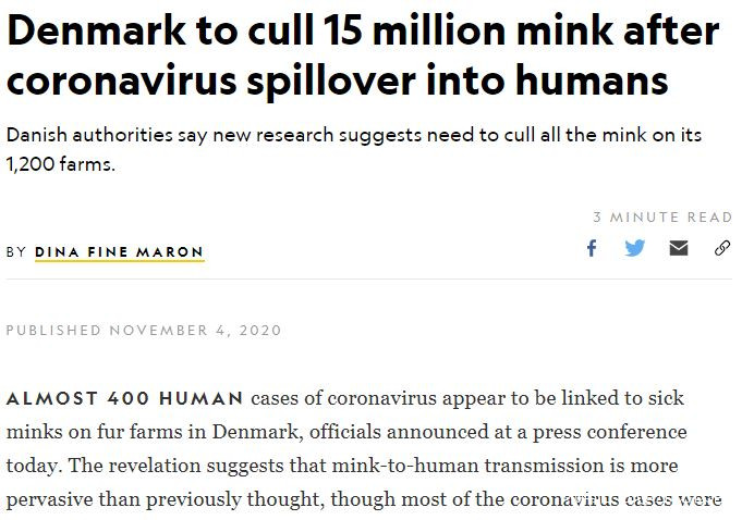新冠新起源 - 丹麥即將撲殺全部1500萬隻貂,已感染400人_風聞