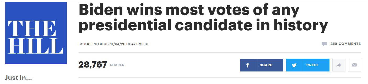 11月4日,美國媒體《國會山報》(The Hill)表示,拜登目前所獲選票數為美國曆屆總統候選人之首。