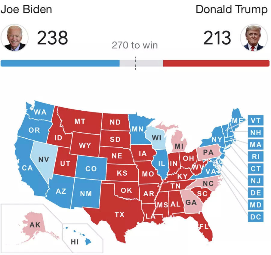 不過,到了今天晚上,隨着郵寄選票的姍姍來遲,拜登又從絕境中殺出一條血路,先是在10票的威斯康星州翻藍,給自己爭取到了翻盤的機會。