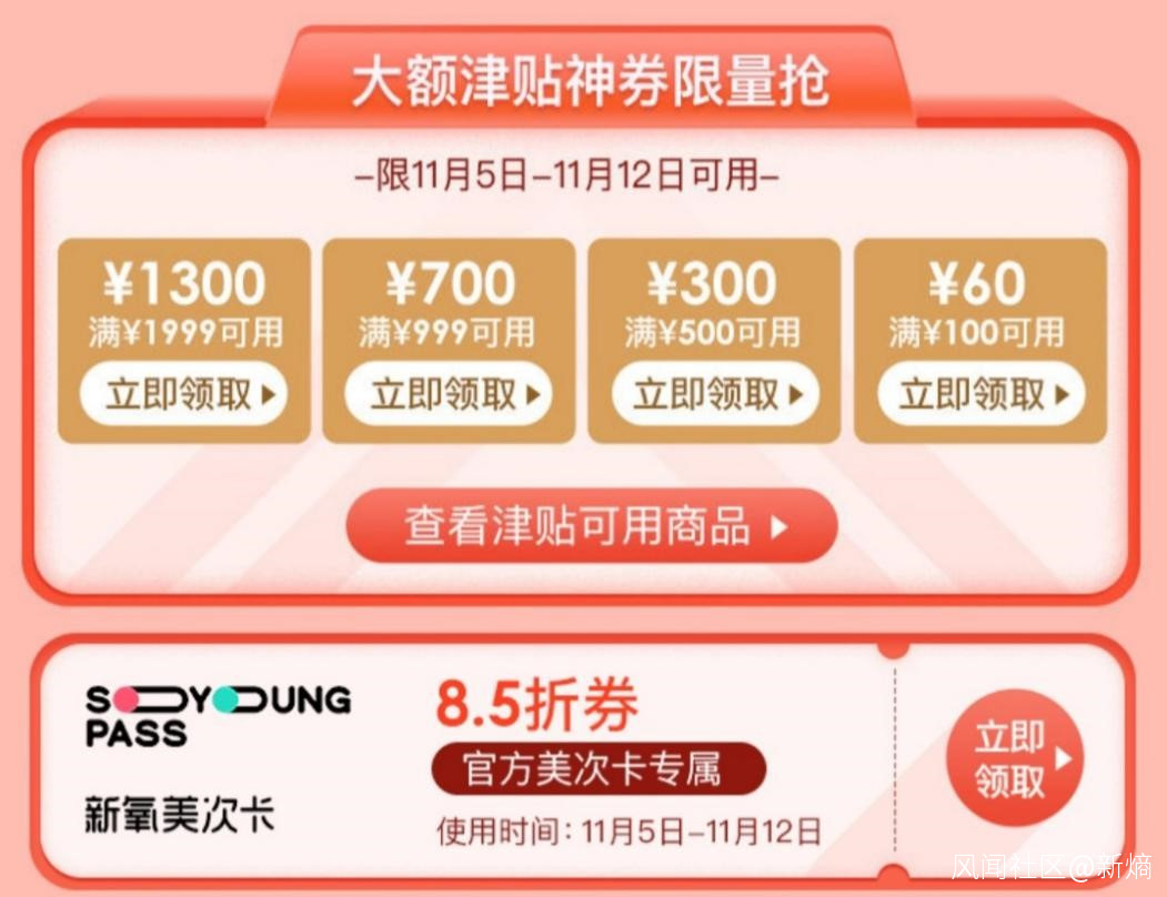 11月5日至12日,新氧更為求美者準備了5折閃GO、低到5折等鉅惠。同一時段,求美者此前在“11.11醫美狂歡節”主題頁領取的滿1999減1300、滿999減700、滿500減300、滿100減60等大額津貼,以及新氧美次卡8.5折券,均可使用。