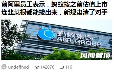 《前阿里員工表示,螞蟻按之前估值上市連韭菜根都能拔出來,新規也給他們肅清了對手》——undefined