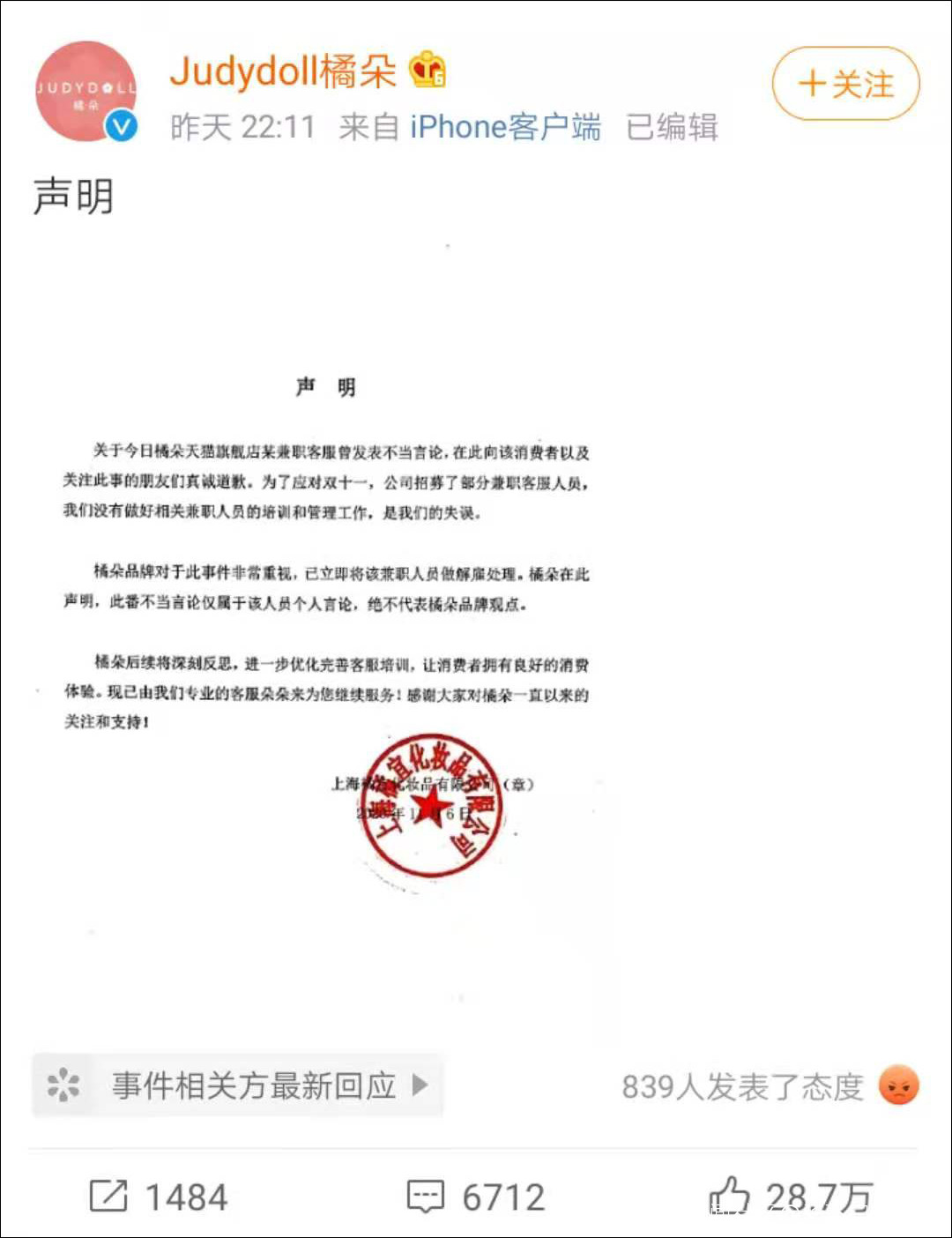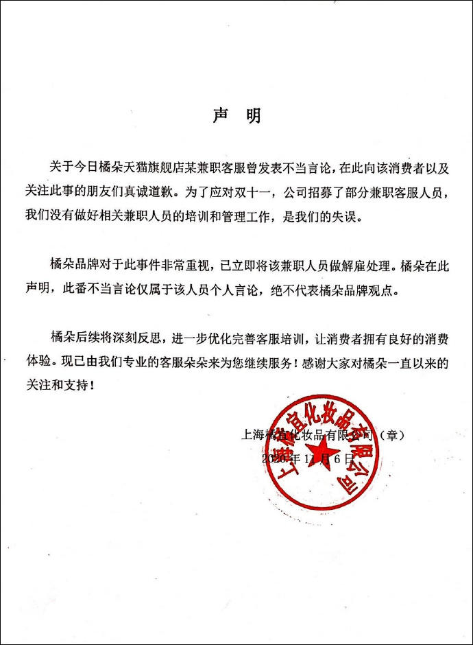 11月6日晚22:11,橘朵官方微博@Judydoll橘朵 發佈道歉聲明,稱“關於今日橘朵天貓旗艦店兼職客服的不當言論,在此向消費者以及關注此事的朋友們真誠道歉。”