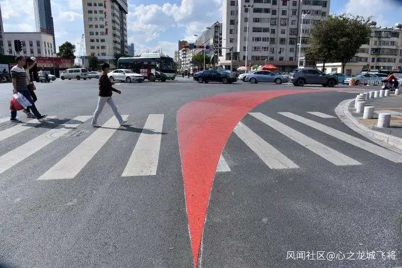 紅顏色的“右轉彎盲區警示帶”,用於提示過往的非機動車及行人通過此區域時,如遇車輛尤其是大型車輛右轉時要進行避讓,切不可在此區域停留;同時提醒車輛轉彎時也應控制車輛的轉彎半徑使其“內輪差”不超出此區域。