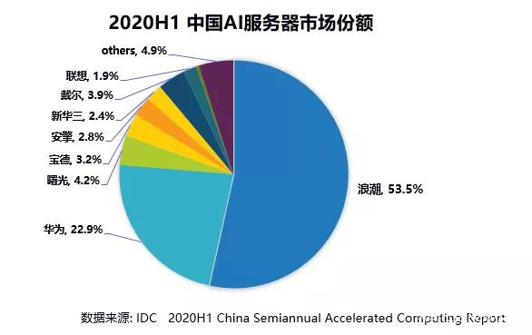 在火熱的AI服務器市場中,浪潮的表現可謂一騎絕塵。2020年上半年,浪潮AI服務器銷售額達到6.88億美元,市場份額佔比53.5%。從市場規模和產品能力來看,浪潮早已經進入了該領域的領導者象限。