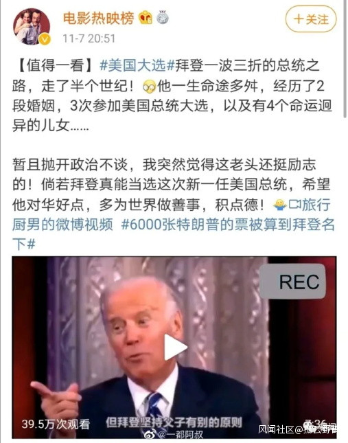 昨天,在微博上就突然出現了大批量的、特別整齊劃一的對拜登及美國民主黨歌頌、猛舔的內容。