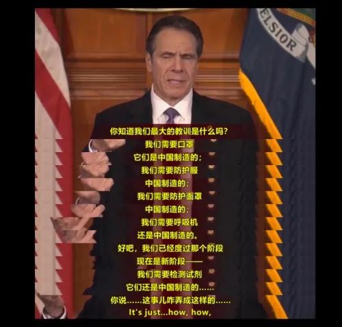 “我們需要口罩,它們是中國製造的。我們需要防護服,它們是中國製造的。我們需要防護面罩,它們是中國製造的。我們需要呼吸機,它們是中國製造的。我們需要檢測試劑,它們是中國製造的。你説……這……怎麼……”