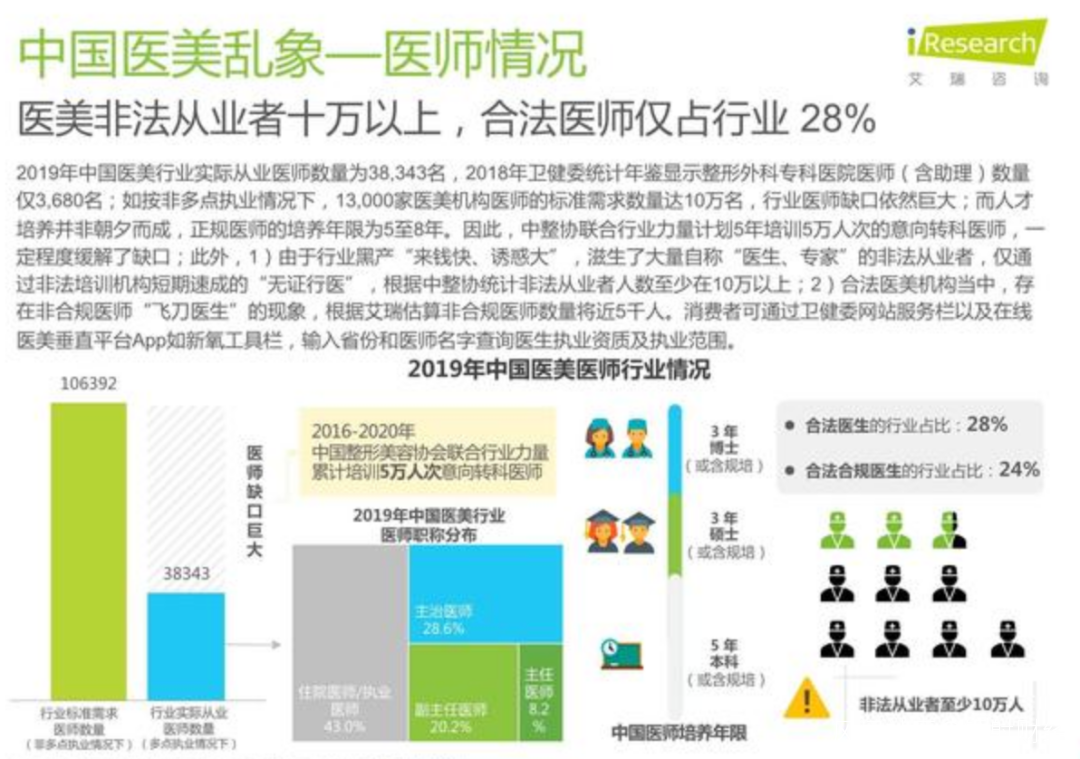 同時,合法醫美機構當中,存在非合規醫師“飛刀醫生”的現象,根據艾瑞估算,非合規醫師數量將近5000人。市面上流通的針劑正品率只有33.3%,也就是1支正品針劑背後伴隨着至少2支非法針劑的流通。