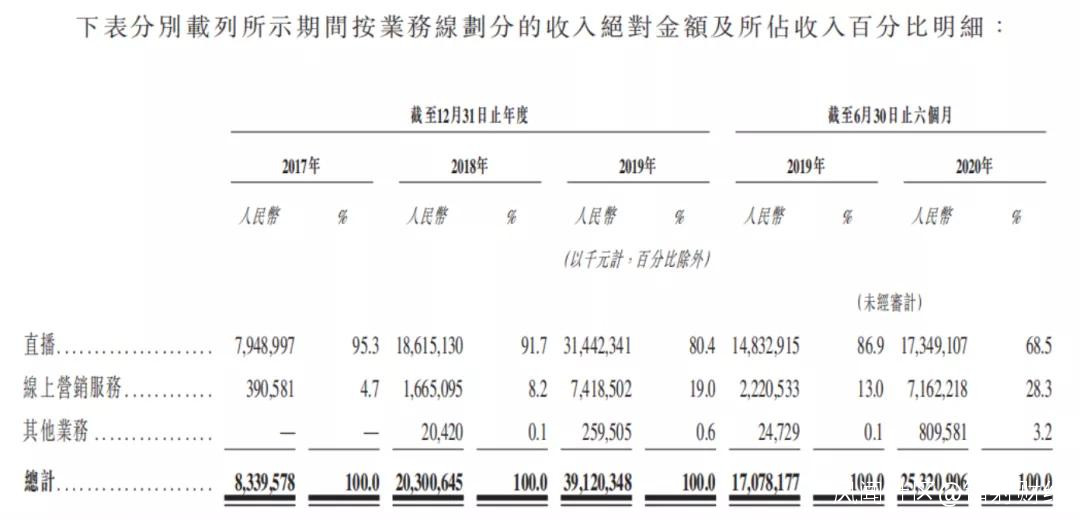 從營收佔比來看,2017年至2019年,直播收入佔總收入比重分別為95.3%、91.7%、80.4%;但到了2020年上半年,直播營收佔比降為68.5%。