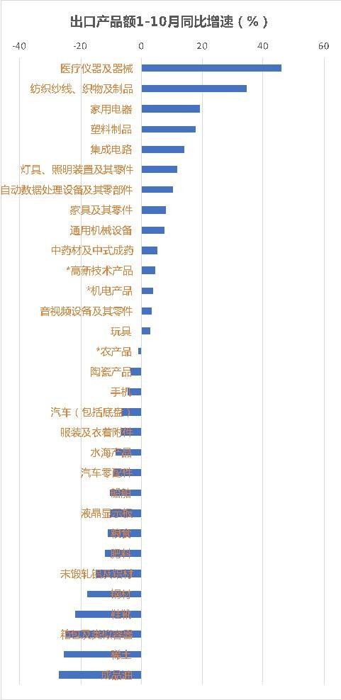 按照1-10月不同出口產品的累計同比增速來看,對出口增速貢獻靠前的五項依次為醫療儀器及器械,紡織紗線、織物及製品,家用電器,塑料製品,集成電路。