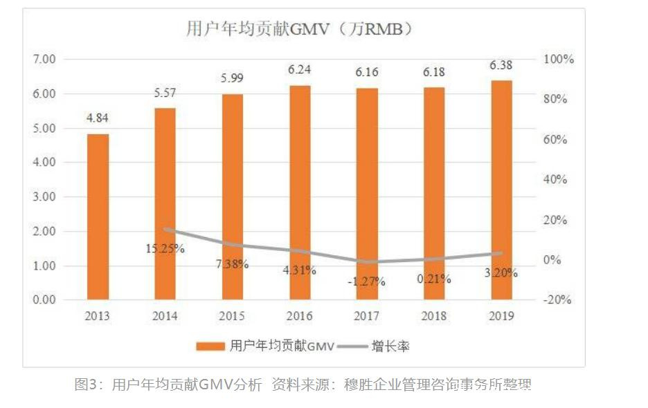 而私域流量正好是挖掘老用户的一個方式之一——如下圖所示,以用户年均貢獻GMV來看,從2017年開始,用户年均貢獻GMV增速已經維持在5%以下,幾乎停滯,2017年還出現了負增長,這就體現企業,老用户開始需要好好經營一下了。