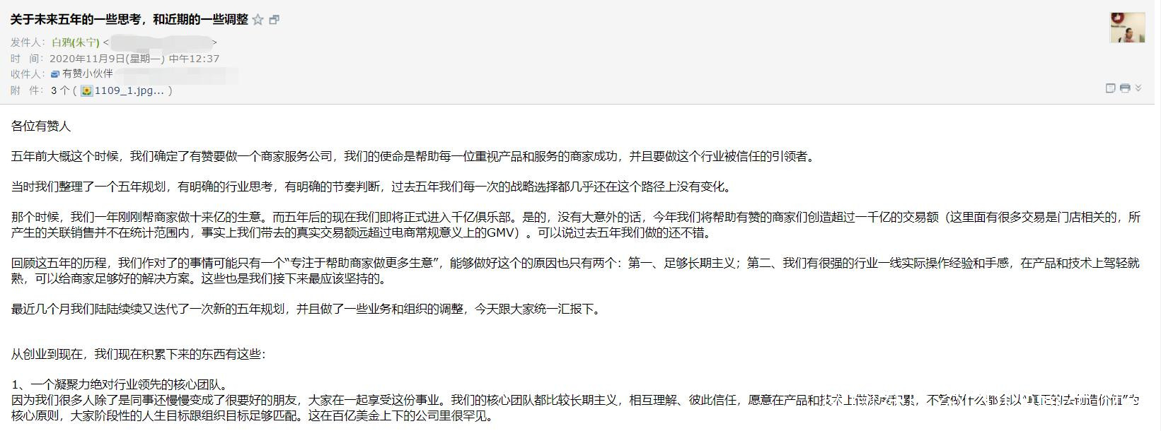 據媒體資料顯示,2020年11月9日,有贊CEO白鴉還在內部發布全員郵件稱:今年有贊服務的商家GMV即將超過千億,未來有贊將不斷豐富完整產品和服務,從一個SaaS為主的解決方案公司,到運營數據的智能商業服務公司。