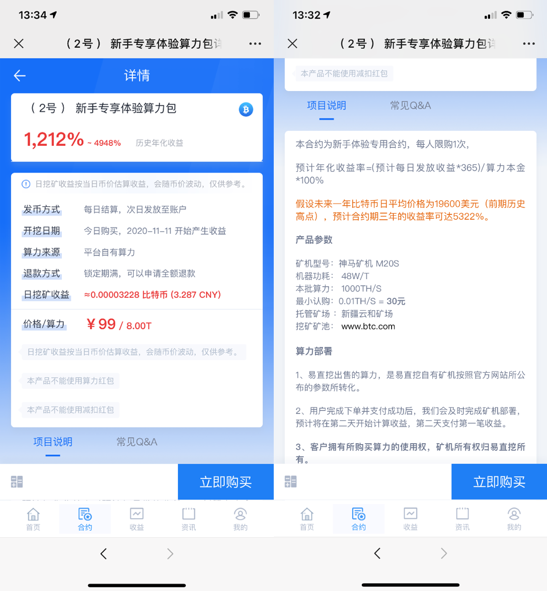 由此得出,所謂靜態收益僅是參考,挖礦需考慮各種外部環境。而在名為“易直挖”平台,99元新手包,算力8T,週期為7天,歷史年化收益1209%—4948%。