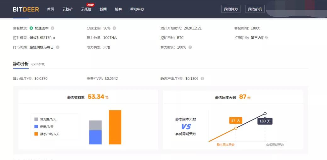 另BTC/BCH所用的是螞蟻礦機S17Pro,以“180天(週期)100TH/S(算力數量)666美元”套餐為例,官網顯示,靜態收益率53.34%(變動),靜態回本天數87天。