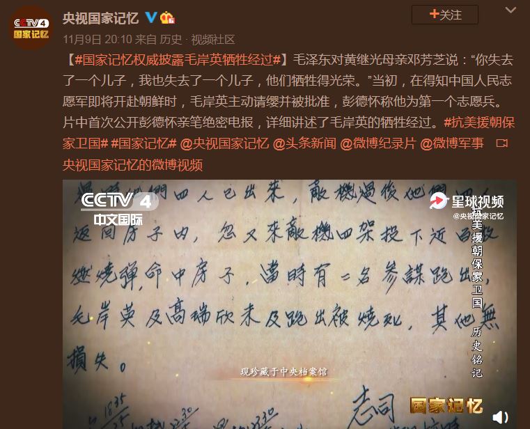 11月9日,在央視播出的紀錄片《抗美援朝保家衞國(第二十集:歷史銘記) 》中,首次公開了1950年11月25日,彭德懷發給中央軍委的絕密電報,裏面記載了毛岸英犧牲的細節。