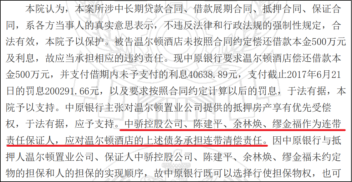 以涉及陳建平的一份判決書為例,經法院認定,她與其他幾位當事人作為債務人滑縣中驕温爾頓酒店有限公司的保證人,應當在債務人未償還借款且違約的情況下,承擔還款和賠償的責任,總計約524萬。