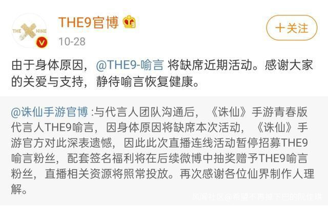 此外,喻言還多次缺席團體活動,團體海報中也不見其身影,被認為是因不當言論遭到雪藏。不過隨後THE9官博宣佈喻言是因腳傷暫時缺席團體活動。