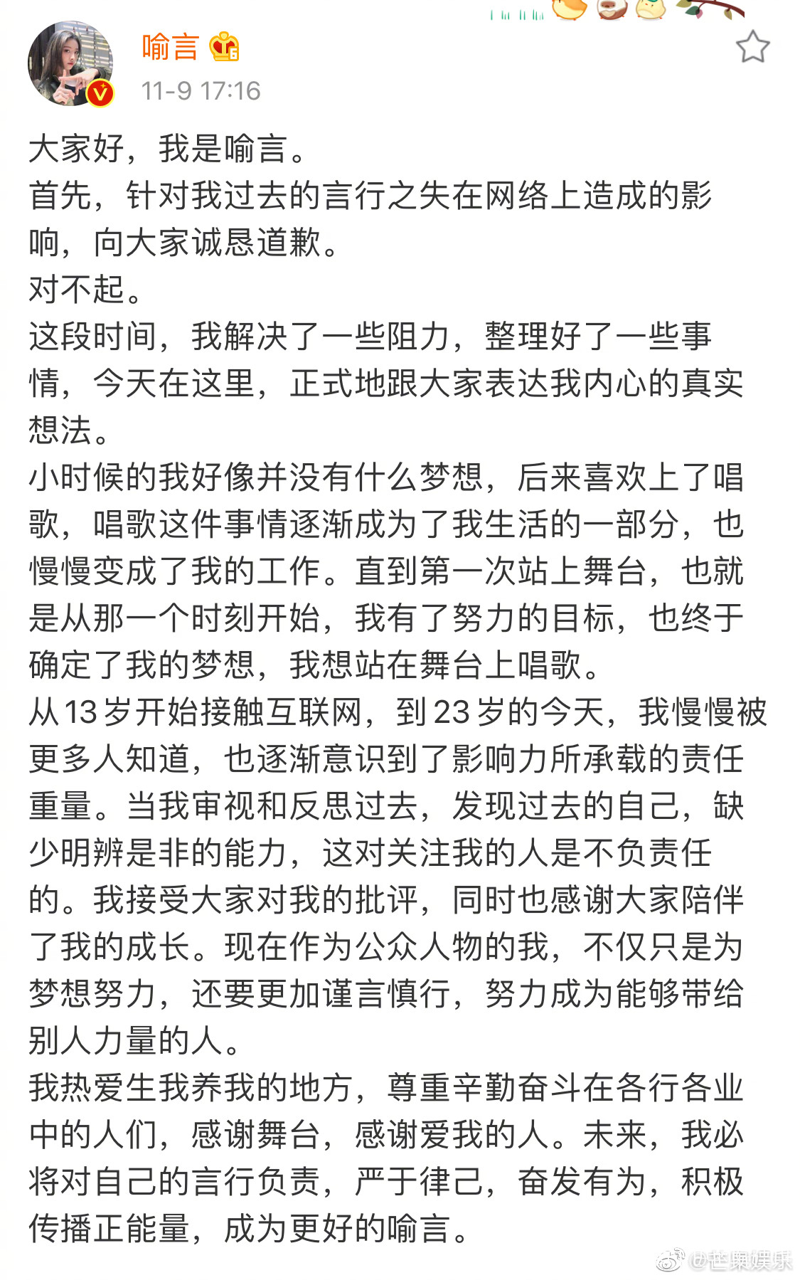 “從13歲開始接觸互聯網,到23歲的今天,我慢慢被更多人知道,也逐漸意識到了影響力所承載的責任重量。當我審視和反思過去,發現過去的自己,缺少明辨是非的能力,這對關注我的人是不負責任的。我接受大家對我的批評,同時也感謝大家陪伴了我的成長。現在作為公眾人物的我,不僅只是為夢想努力,還要更加謹言慎行,努力成為能夠帶給別人力量的人。”