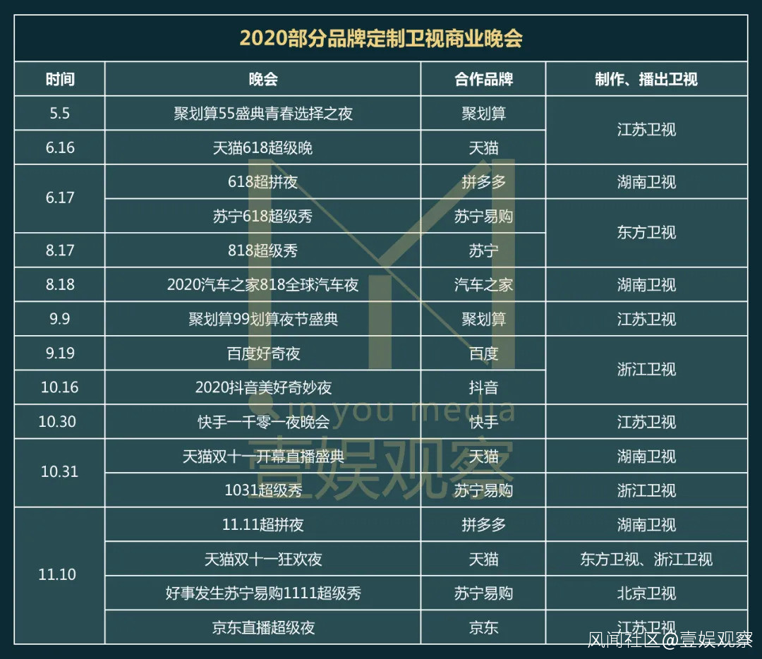 可以預見,未來電商、品牌定製晚會將會是衞視的趨勢,也是其繼續佈局和發力的重點之一,但這晚會依舊是頭部衞視們的較量,網傳明年湖南衞視月月都會有晚會,而浙江衞視也保底衝向10場,而這些晚會背後,絕大多數都會以品牌定製為主。