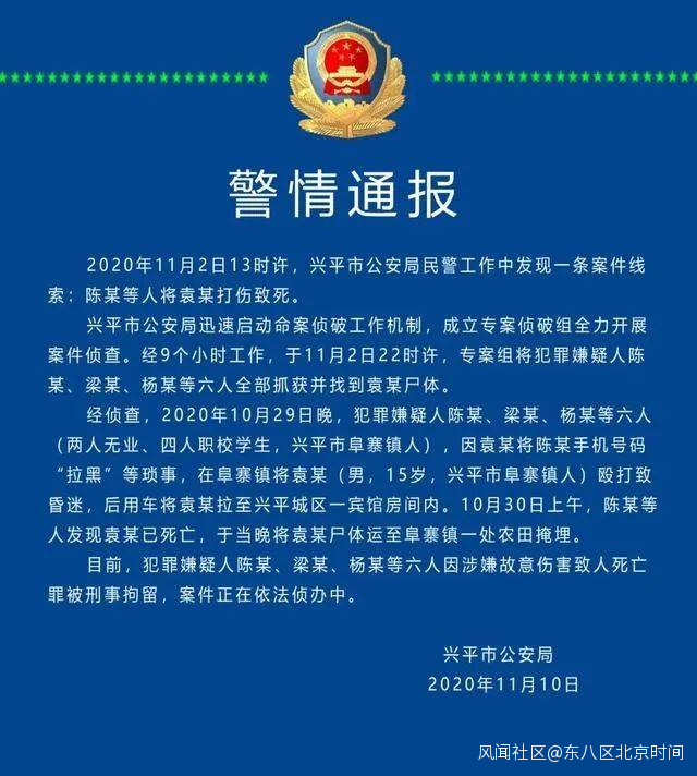 通報顯示,經偵查,2020年10月29日晚,犯罪嫌疑人陳某、梁某、楊某等六人(兩人無業、四人職校學生,興平市阜寨鎮人),因袁某將陳某手機號碼“拉黑”等瑣事,在阜寨鎮將袁某(男,15歲,興平市阜寨鎮人)毆打致昏迷,後用車將袁某拉至興平城區一賓館房間內。10月30日上午,陳某等人發現袁某已死亡,於當晩將袁某屍體運至阜寨鎮一處農田掩埋。