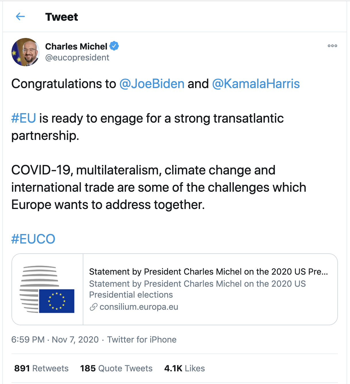 夏爾·米歇爾在歐洲中部時間11月7日傍晚6時59分發出賀電,動作也算很快。