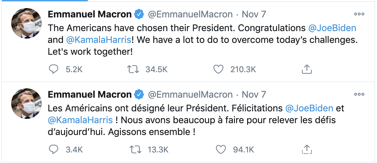 法國總統馬克龍以英法雙語發出了祝賀的推特。文中甚至用上了感嘆號,激動之情可見一斑。