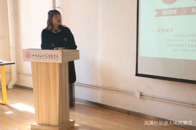 接下來,梁澤慧學姐與同學們分享了辦好一個活動的具體要求。從活動前期的撰寫策劃、活動宣傳、人員分配、確定流程,到活動中期的物資準備、佈置現場、彩排、整理流程,再到活動後期的還原現場、結束優學派、活動總結,一場活動的舉辦要經歷一個很長的準備過程。我校完滿活動豐富多彩,因此需要同學們具有一定的組織活動的能力,通過樑澤慧學姐生動形象的講解,帶大家瞭解組織活動時的注意事項和策劃流程,幫助同學們掌握基本策劃能力。這有利於每一位同學更好的參與活動的準備工作,同時也有利於活動更好的進行。