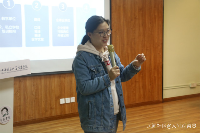 老師介紹完完滿活動後,便問同學們對自己的專業知識瞭解多少,這個問題卻難住了很多同學。之後,張玉潔老師就外語系專業方面向同學們進行了大體介紹,包括外語系各專業課程分類以及各個專業的側重方向。張玉潔老師提到,英語專業的學習,最重要的就是聽和説。不要害怕、不要自卑,要敢於練習,敢於開口。張玉潔老師鼓勵同學們在平時的學習中重點練習,自主學習,及時複習。做到温故知新,持之以恆。