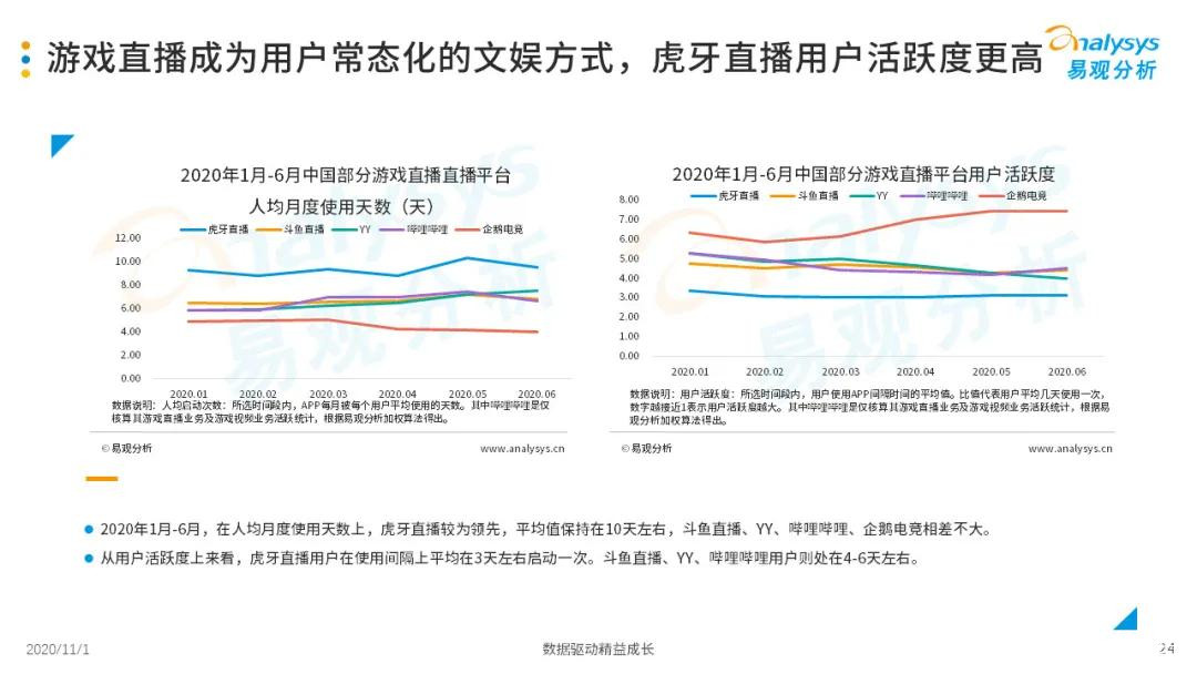 值得注意的是,據易觀《中國遊戲直播市場發展綜合分析2020》報告顯示,2020年上半年,虎牙直播在用户活躍度表現上突出——人均月度使用天數均值在10天左右,使用間隔在3天左右。