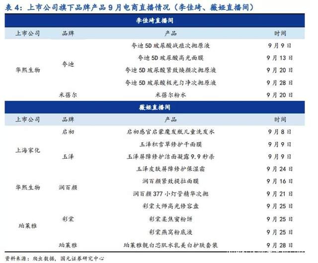 以今年9月為例,華熙生物旗下化妝品品牌誇迪和米蓓爾先後5次出現在網紅李佳琪的直播間裏,潤百顏則2次出現在薇婭直播間。另珀萊雅和上海家化也攜自家子品牌試水與薇婭合作,目前來看效果顯著。