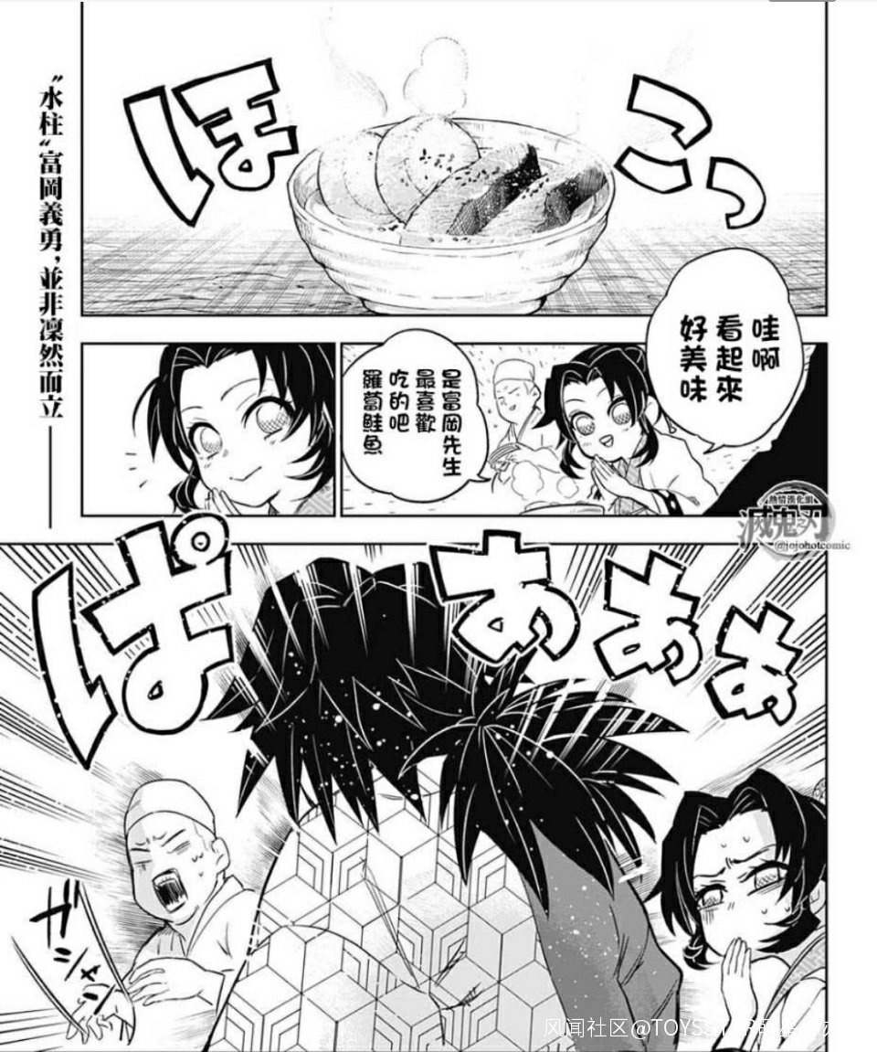 平時冷冰冰的 富岡義勇 也會笑哦!在漫畫中因為吃到了美味的“蘿蔔鮭魚(鮭大根)”,露出了神秘的一幕,據説就只有師傅和蝴蝶忍見過…