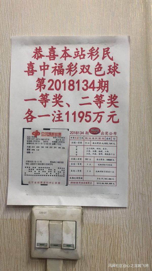 彩票投注站當時貼出的“喜訊”。當晚,福彩“雙色球”第2018134期開獎,郭貽燦成為大贏家。他除了中得一等獎裏的特別獎,還中了一注二等獎及若干固定獎,獎金共計1195萬餘元。
