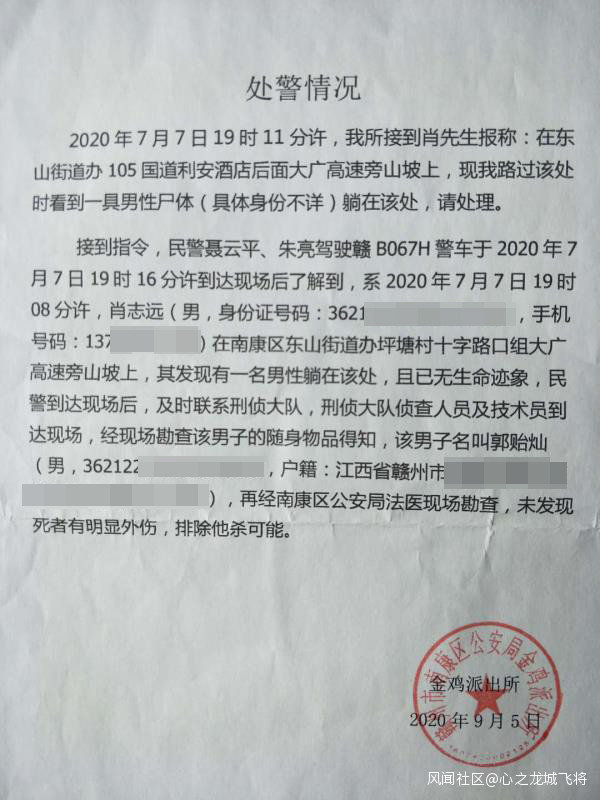 警方出具的《處警情況》。南康區公安局金雞派出所出具的《處警情況》顯示,死者身份確定為郭貽燦,“經法醫現場勘查,未發現死者有明顯外傷,排除他殺可能。”