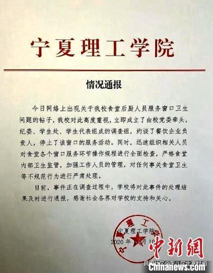 10日當晚,寧夏理工學院《情況通報》予以回應,稱已成立了由校黨委牽頭,紀委、學生處、學生代表組成的調查組,約談了餐飲企業負責人,停止了該窗口的服務活動。同時,迅速組織相關人員對食堂各個窗口服務環節操作規程進行全面檢查,嚴格食堂內部衞生監管,加強工作人員的管理,對任何事關食堂衞生等不規範行為進行嚴肅處理。
