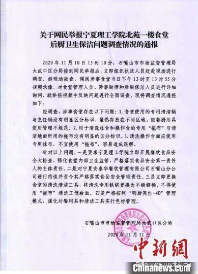石嘴山市市場監督管理局大武口分局11月11日下午發佈的《關於網民舉報寧夏理工學院北苑一樓食堂後廚衞生保潔問題調查情況的通報》,對事件進一步説明。石嘴山市市場監督管理局大武口分局供圖