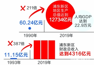 2019年,浦東新區地區生產總值達到12734億元,是1990年60.24億元的211倍,人均GDP達到22.9萬元,“浦東速度”成為中國改革開放的靚麗名片。
