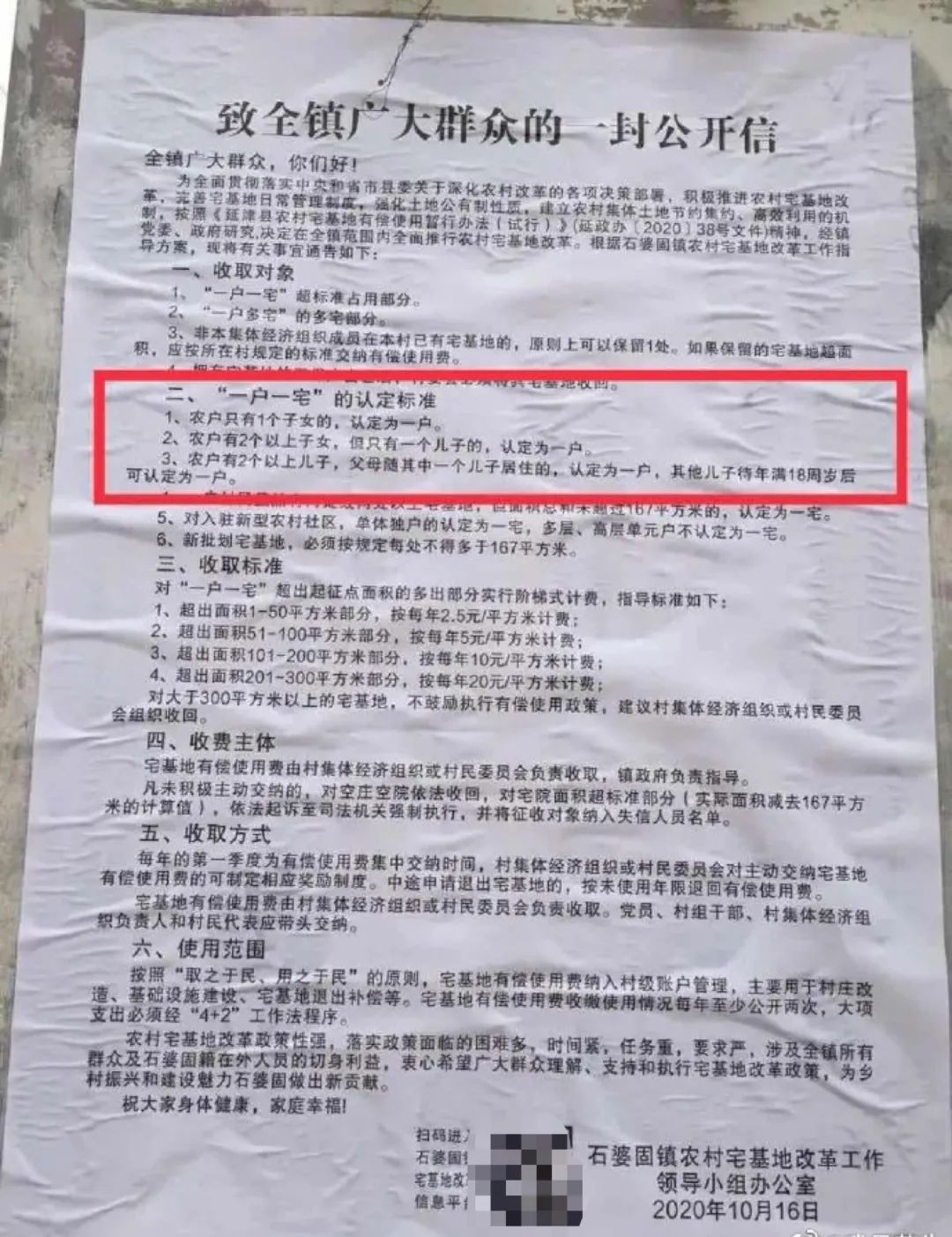 在張貼出來的公開信中,石婆固鎮要在全鎮範圍內全面推行農村宅基地改革,明確“一户一宅”、宅基地基本面積,超佔面積的的認定和費用收取標準等等。