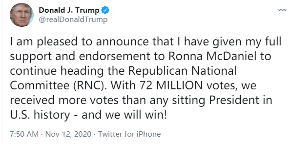 “我很高興地宣佈,我對羅納·麥克丹尼爾(Ronna McDaniel)繼續領導RNC表示全力支持和贊同。憑藉7200萬張選票,我們成為了美國歷史上獲得最多選票的在任總統。我們將獲勝!”特朗普在一條推文中説。