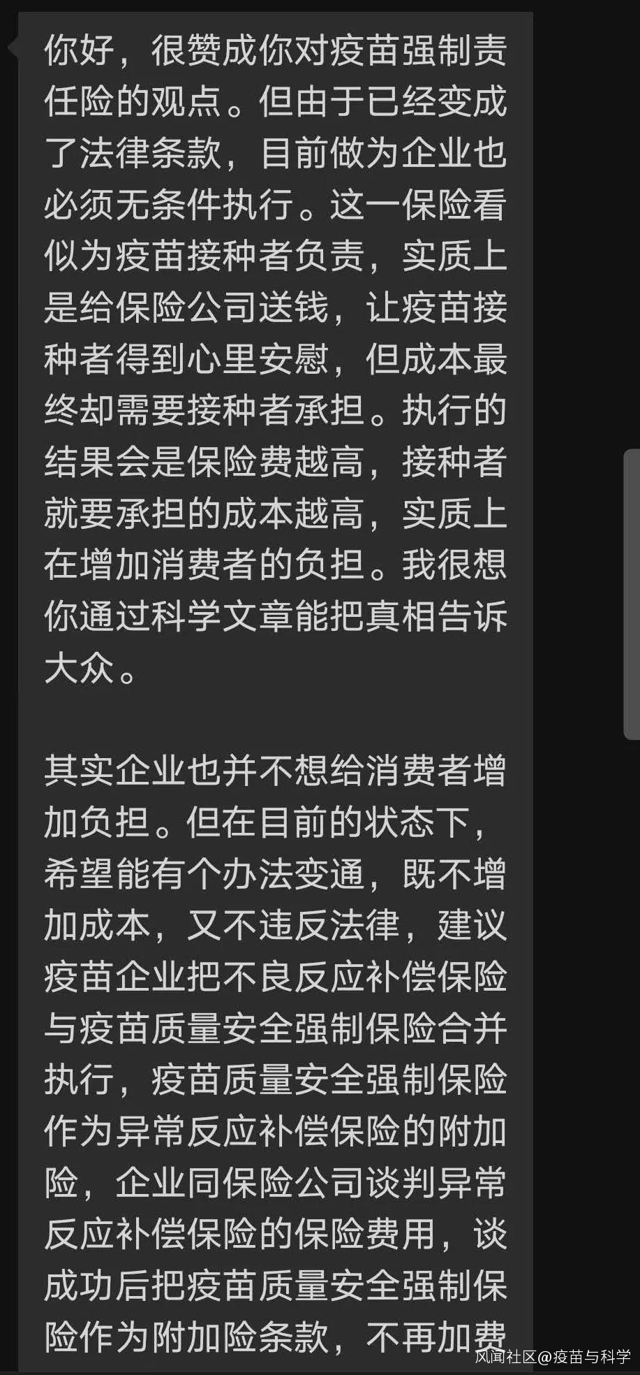 點擊添加圖片描述(最多60個字) 編輯第二位朋友明確指出,疫苗強責險是給保險公司送錢,但已經既成事實,不得不執行。所以,他們想了一個辦法,把原來每年準備用於疫苗不良反應補償的錢用於購買不良反應補償險,疫苗強責險以附加險形式加入,給其一個存在感即可。