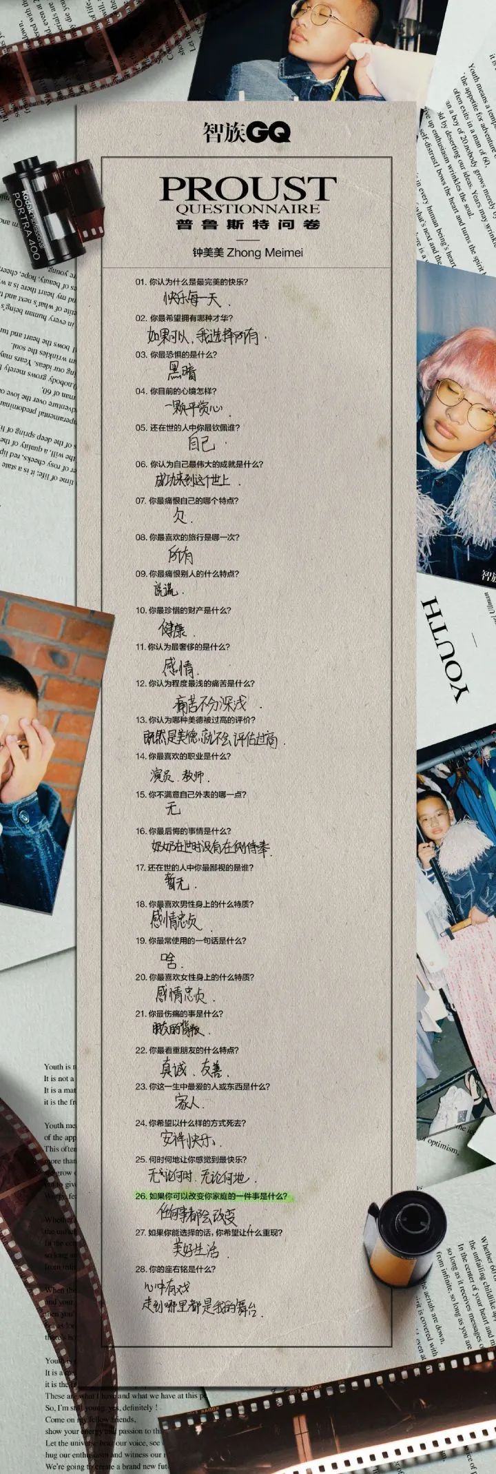 鍾宇升曾經登上過頂級男性雜誌《智族GQ》的封面,和其他參與拍攝的明星一樣填寫了一份答卷。在這份答卷裏,有個問題是“你認為程度最淺的痛苦是什麼?”