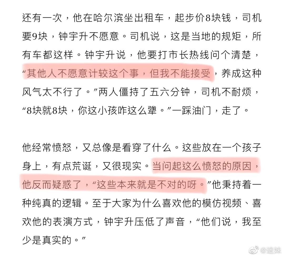 對鍾宇升而言,公平是一件特別重要的事。他曾在哈爾濱坐出租車,因為司機按所謂的當地規矩將起步價從8元提高到9元,他掏起手機就要打市長熱線問個清楚。最後司機大哥只得認慫,以8元起步價載了這個執拗的小孩。