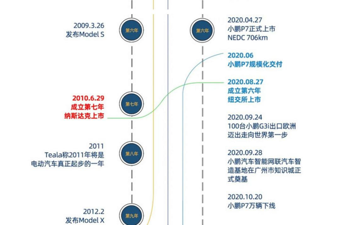 公開資料顯示,特斯拉成立於2003年7月,直到2009年3月才發佈第一代Model S,一年後即2010年6月登陸納斯達克,而小鵬汽車只用了6年就成功紐交所上市,與此同時,在成立6年後小鵬汽車還同時實現了P7的規模化交付。