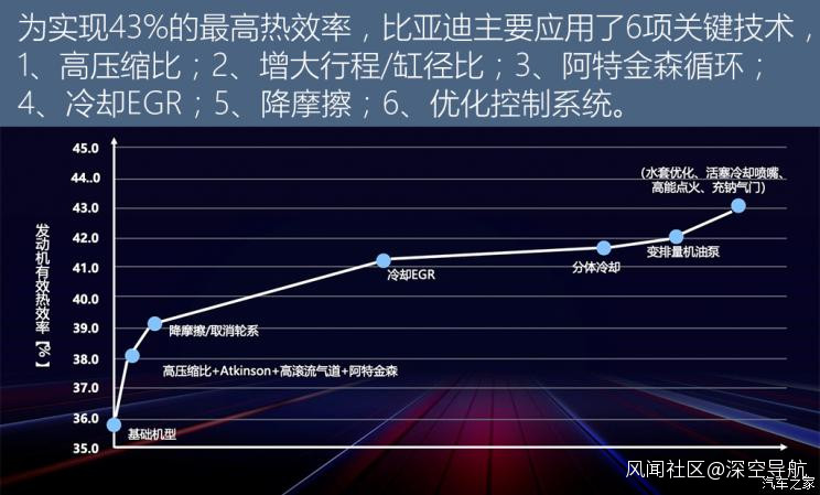 在過去很長一段時間內,中國品牌車企的汽油發動機最高熱效率在37%以內,近些年從奇瑞1.5T的37.1%,廣汽2.0T的38%,一汽2.0T的39%,再到長安藍鯨1.4T的40%、廣汽2.0L混動專用發動機的42.1%(未量產),中國發動機在熱效率方面的挖掘取得了飛快地進步。而比亞迪的這台新機器將很快打破這樣的記錄。